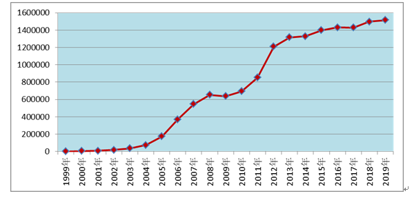 圖1 1999年-2019年全國藥品不良反應(yīng)/事件報(bào)告數(shù)量增長趨勢