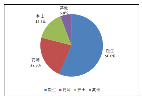 按照報(bào)告人職業(yè)統(tǒng)計(jì),醫(yī)生占56.6%,藥師占22.3%,護(hù)士占15.3%,其他職業(yè)占5.8% (圖4)。