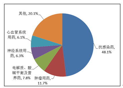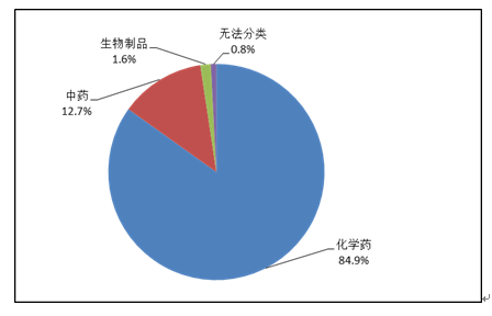 按照藥品類別統(tǒng)計(jì),化學(xué)藥品占86.6%,中藥占12.6%,生物制品占0.8%?;瘜W(xué)藥品排名居前的藥品類別是抗感染藥、心血管系統(tǒng)用藥、腫瘤用藥、神經(jīng)系統(tǒng)用藥、電解質(zhì)、酸堿平衡及營養(yǎng)藥;中藥排名居前的藥品類別是理血?jiǎng)?、補(bǔ)益劑、祛濕劑、開竅劑、清熱劑。