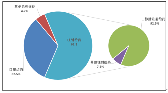 按照藥品給藥途徑統(tǒng)計(jì),注射給藥占67.0%、口服給藥占30.1%、其他給藥途徑占2.9%(圖16)。注射給藥中,靜脈注射給藥占92.7%、其他注射給藥占7.3%。