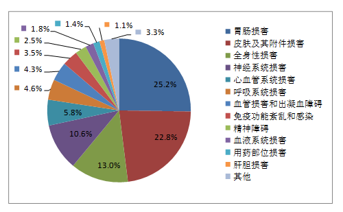 2019年國家基本藥物化學(xué)藥品和生物制品不良反應(yīng)/事件報(bào)告,按照藥品類別統(tǒng)計(jì),報(bào)告數(shù)量排名前5位的分別是抗微生物藥、心血管系統(tǒng)用藥、抗腫瘤藥、激素及影響內(nèi)分泌藥、治療精神障礙藥;累及器官系統(tǒng)排名前5位的是皮膚及其附件損害、胃腸損害、全身性損害、神經(jīng)系統(tǒng)損害以及血液系統(tǒng)損害。